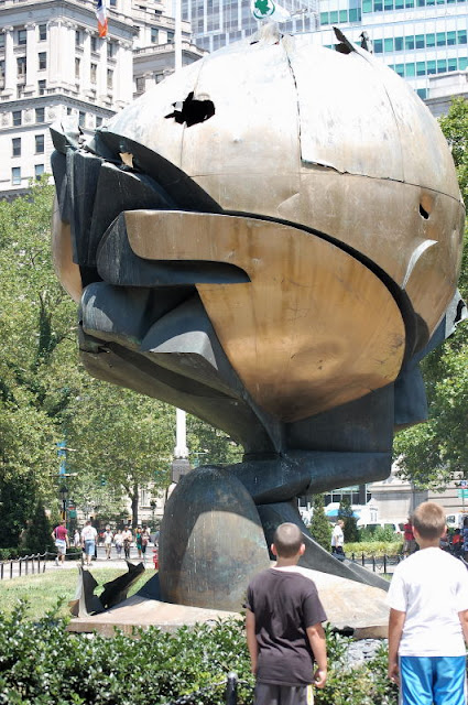 They are rebuilding the towers that were lost on 9/11. The clouds look pretty reflecting on the side of the new building.A north and south fountain stand in the place of the towers. The water cycles itself into a seemingly bottomless pit. There is one tree in between the fountains that withstood the blow of the buildings. I couldn't get near it for all the people that were surrounding it.
